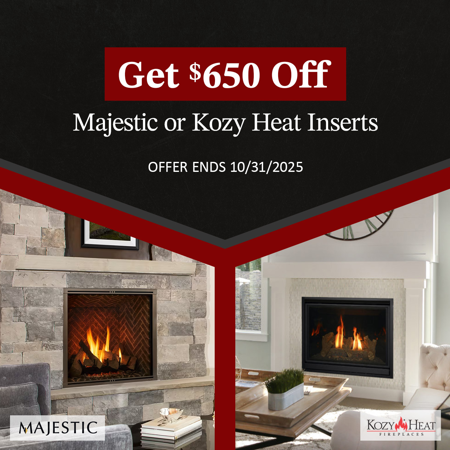 *This offer is valid for $650 off Majestic or Kozy Heat inserts provided by Motown Fire. This promotion cannot be combined with any other promotions. The discount is limited to one per customer and applies to a single insert. Offer ends 10/31/25.