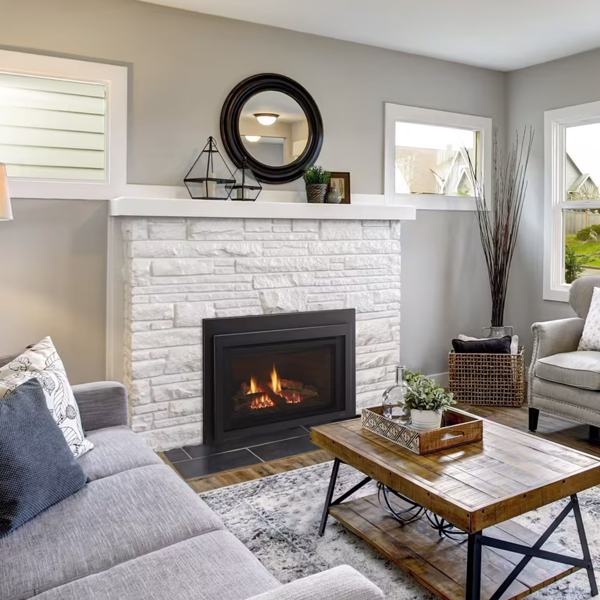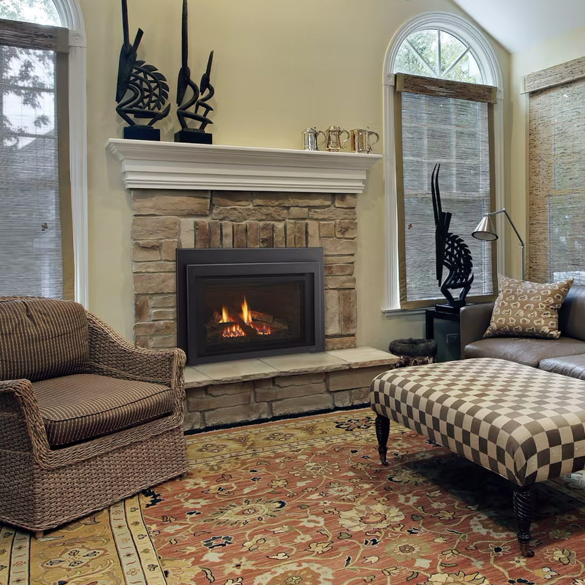 Installing the Jasper gas fireplace from Majestic can be quick and will provide significantly better efficiency than an open wood fireplace. Split-logs and flames deliver the ambiance and look you expect, while removing the effort wood fireplaces require.
